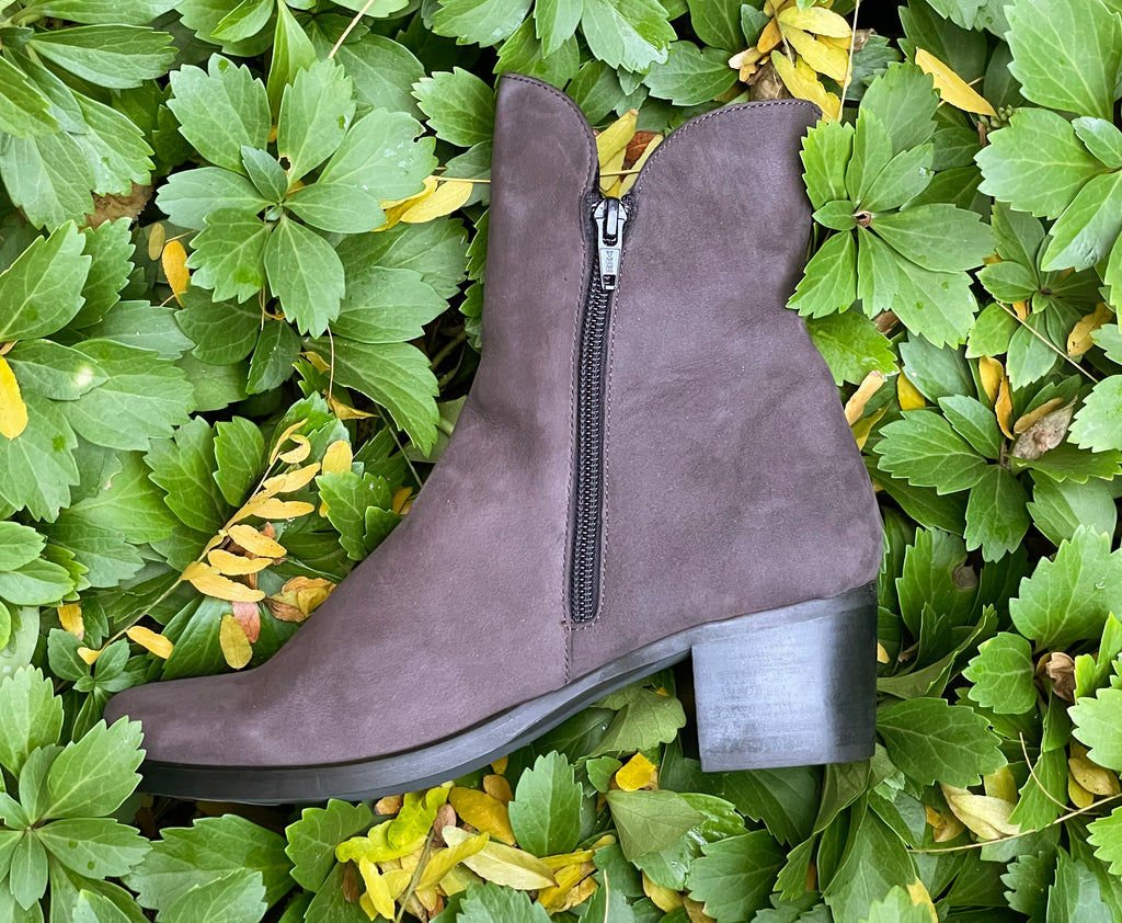 The Pandore boot (photographed) is made with nubuck, also known as suede leather. To clean nubuck leather boots start with removing the extra surface dirt with a medium to soft bristle brush. When only the stain remains, in a circular motion buff out the stain with a leather buffing bar. Brush away any dirt that starts lifting. If the stain is not coming out, try adding a small amount of water to the buffing bar. Once the stain is fully lifted, smooth back the fabric and let your boots dry in a cool area.