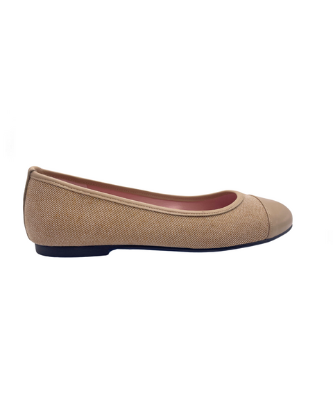 A camel denim flat shoe with a round toe and flat sole.